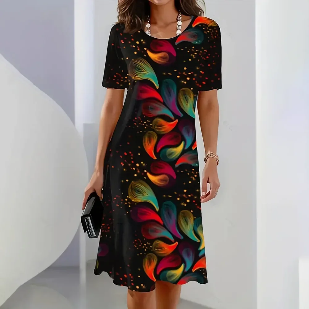 Senhora moda novos vestidos longos tripulação pescoço casual solto elegante 3d floral impresso manga curta saias de comprimento médio verão & outono